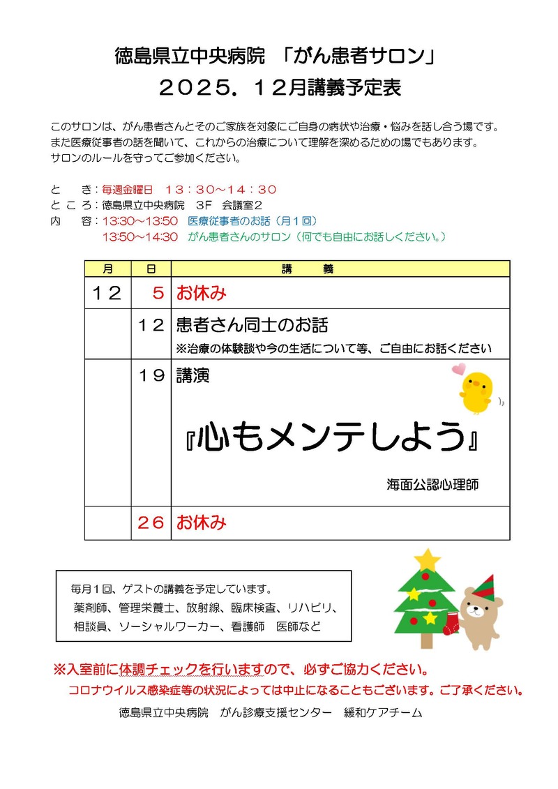 内 容: 13 : 30 ~ 13 : 50 医療従事者のお話(月1回)